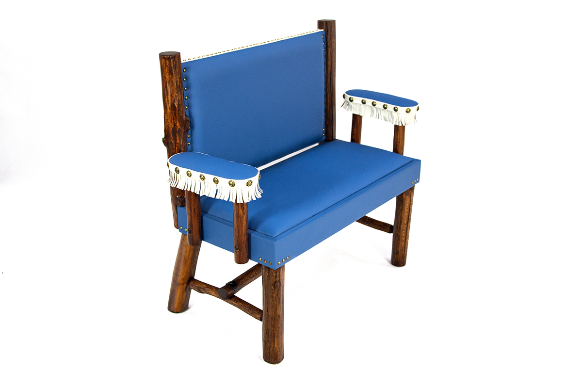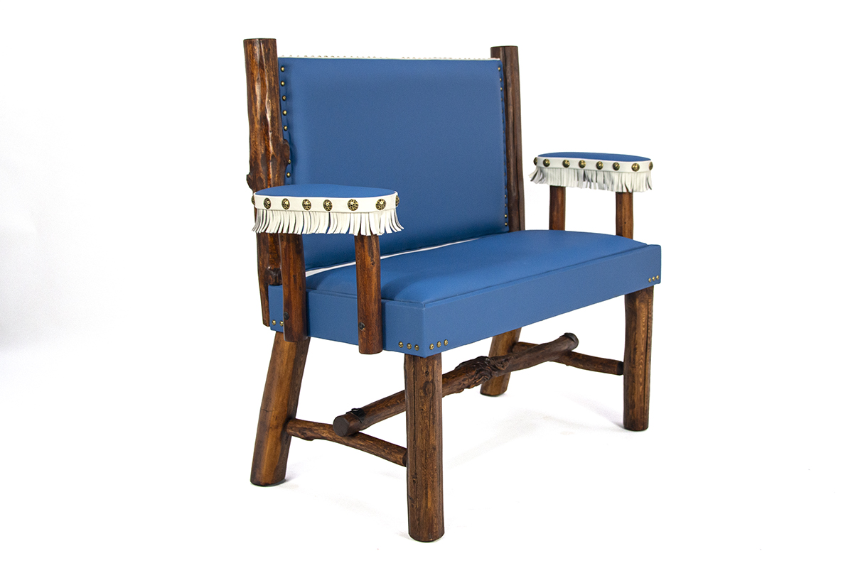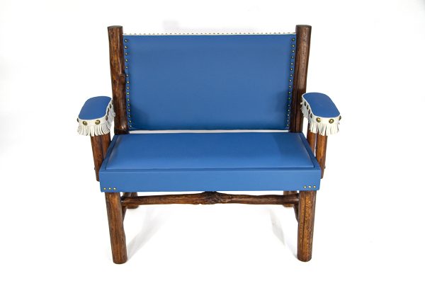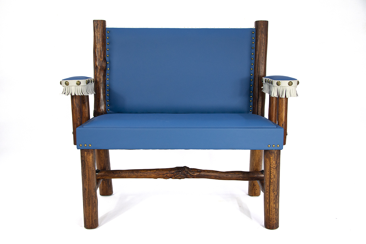 The smooth, high-quality leather is meticulously finished with classic brass tack detailing, creating a silhouette that is as durable as it is visually arresting. For a touch of playful character, the armrests are adorned with crisp white leather fringe and custom-stamped medallions, offering a nod to traditional cowboy regalia while maintaining a clean, upscale aesthetic. Whether placed in a grand entryway, a sun-drenched lodge, or as a statement piece in a modern den, the Blue Bird Settee invites you to sit back and enjoy a unique blend of heritage and high-style comfort.