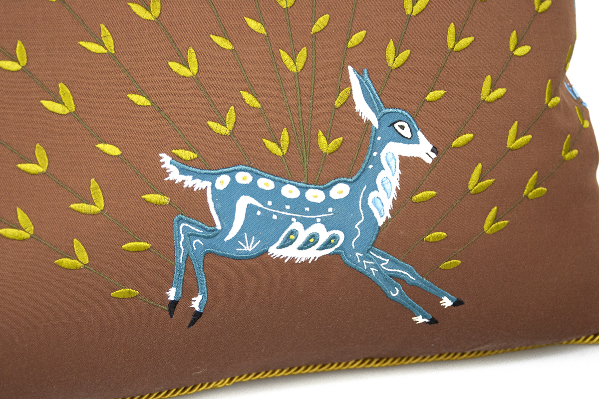 The delightful blue fawn, a creature of imagination, captures the heart, while the hand-stitched botanicals create a dynamic, organic backdrop. Perfect for adding a personalized, artistic flair to any room, this hand-appliqué pillow is for those who cherish unique, handmade items that tell a story and brighten their surroundings with timeless charm.
