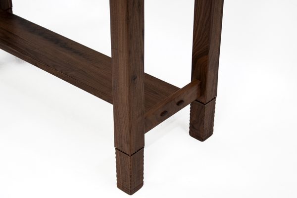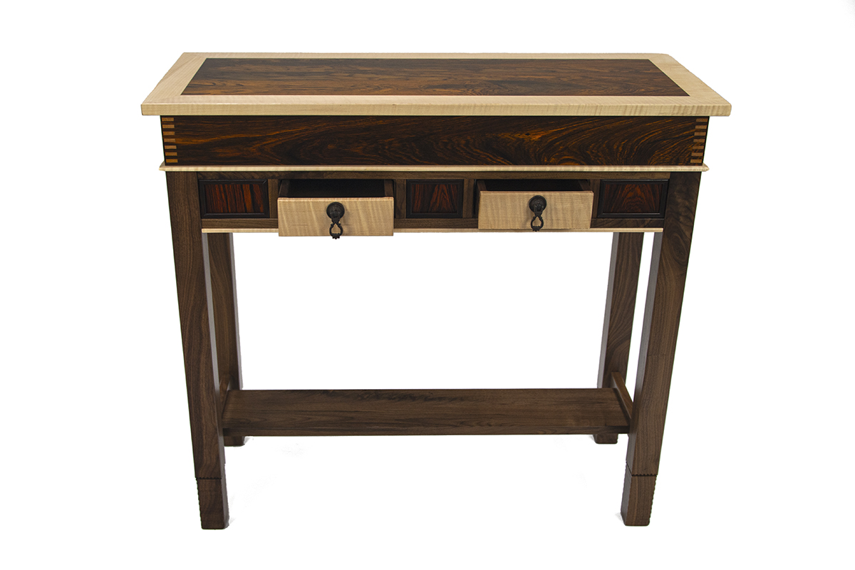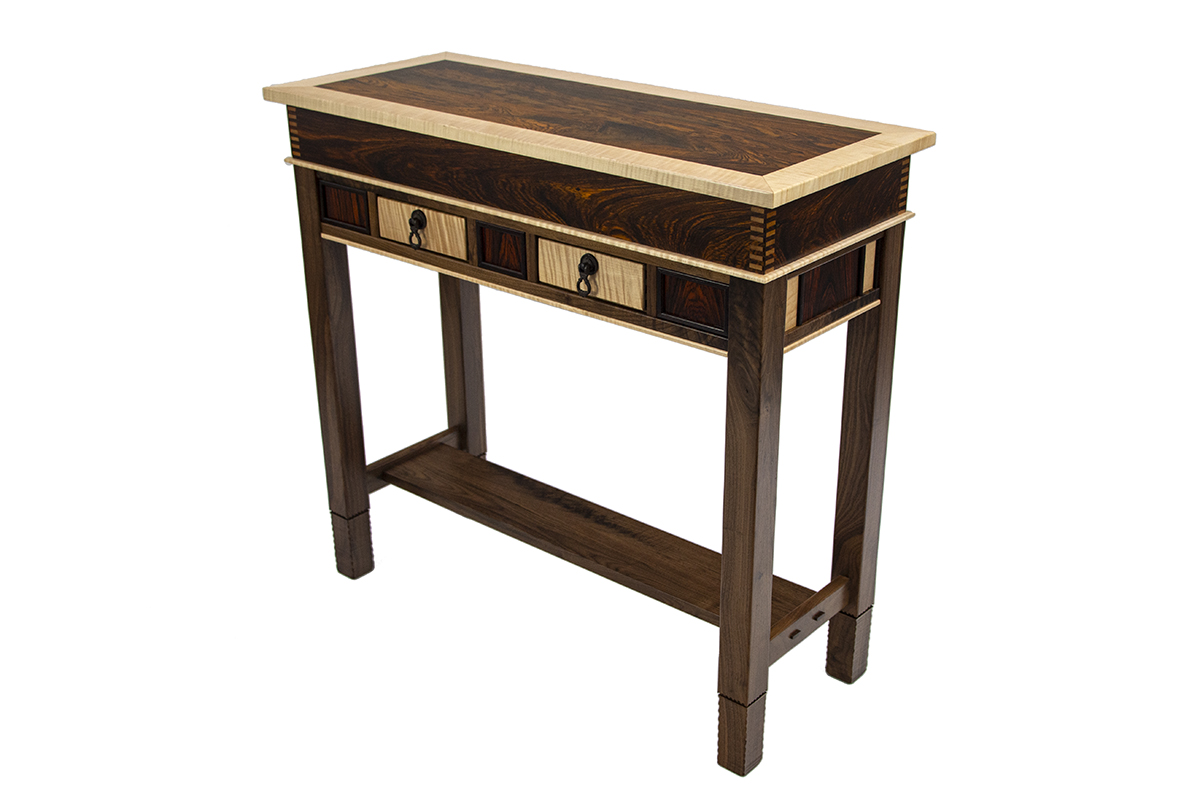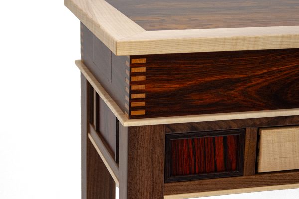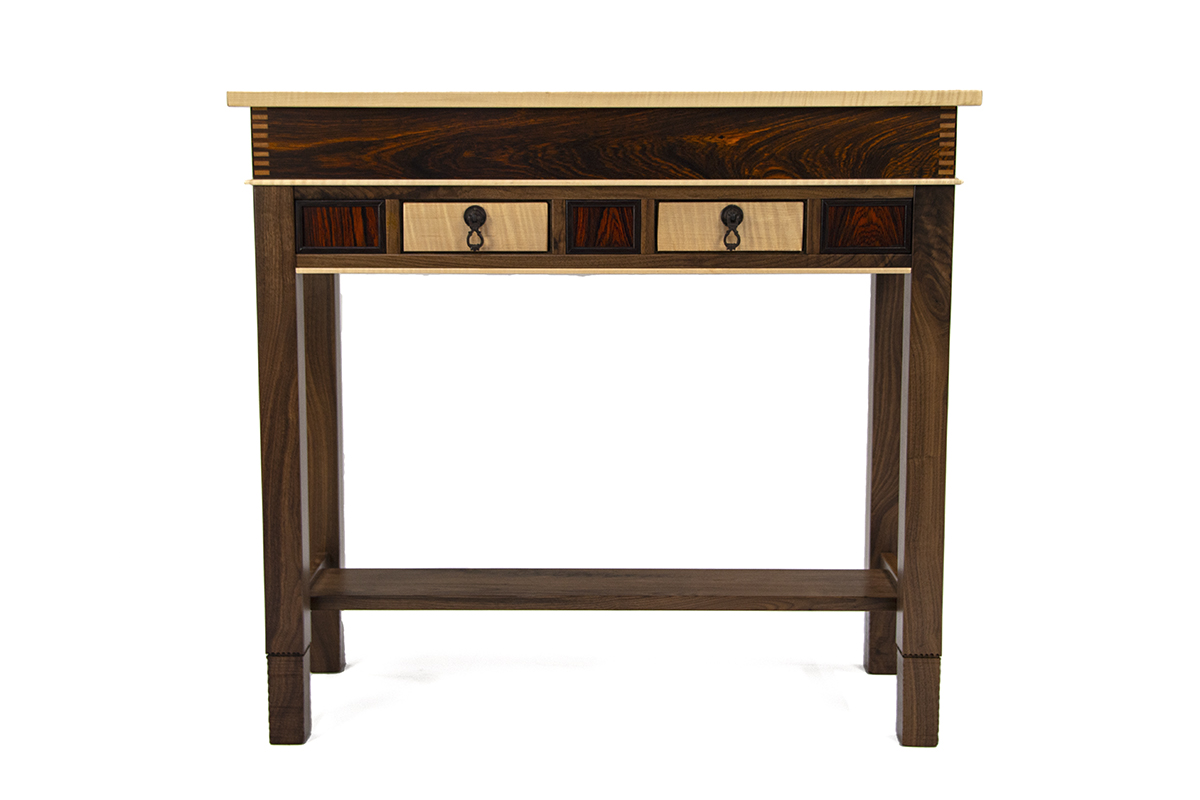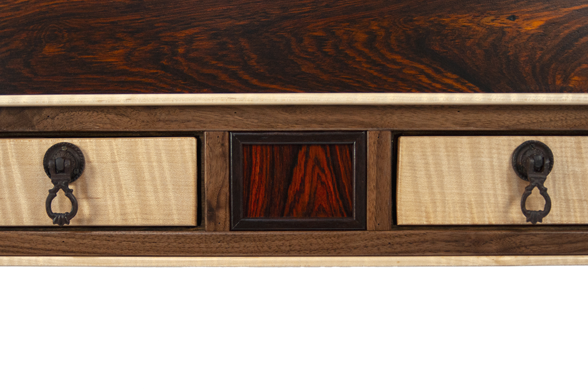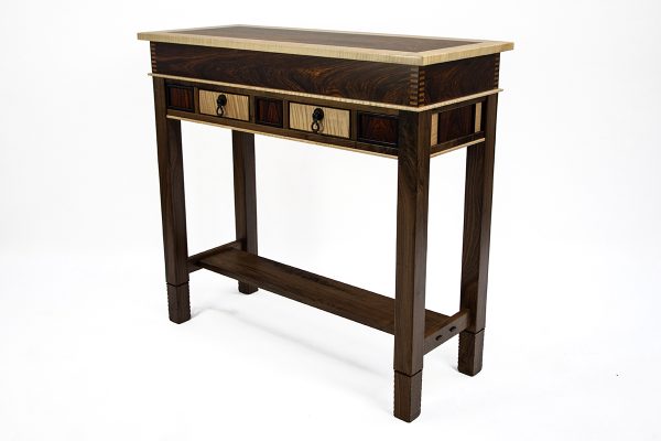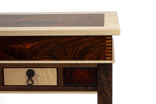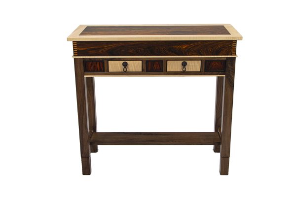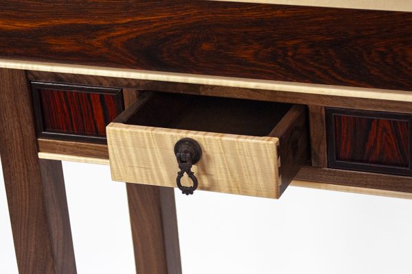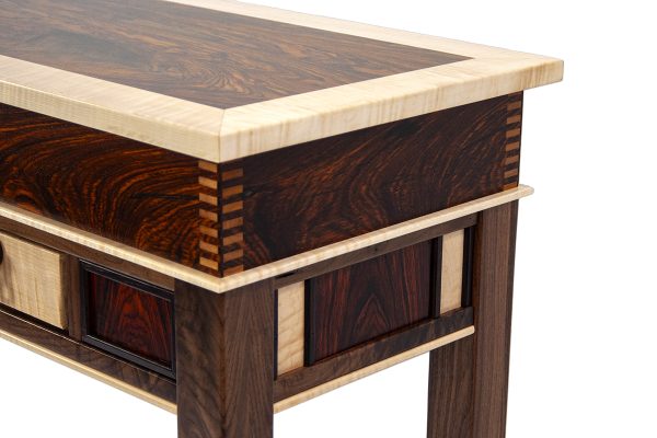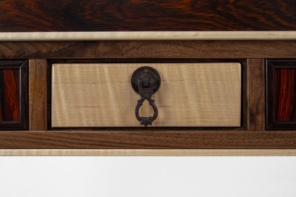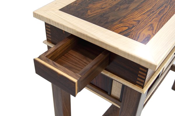 The careful blending of exotic Cocobolo, radiant Curly Maple, and sophisticated Walnut is a testament to the maker’s skill, resulting in a table that is both heirloom-quality and utterly unique. The thoughtful design, complete with a practical lower shelf and two discreet storage drawers, makes it as useful as it is visually arresting. Let this remarkable creation enrich your home with its vibrant complexity and timeless elegance.