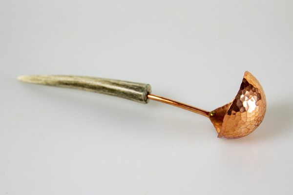 I use traditional metalsmithing techniques including hammering, raising, and chasing by hand with traditional tools, but also tools of my own design. I also use age-old scrimshaw techniques to embellish the burr antler ends and where the antler meets the copper or silver portion of the handle. All of my materials, the purest available copper, silver and naturally-shed antler, are sourced in the USA to create each one-of-a kind piece in my Nashville studio.