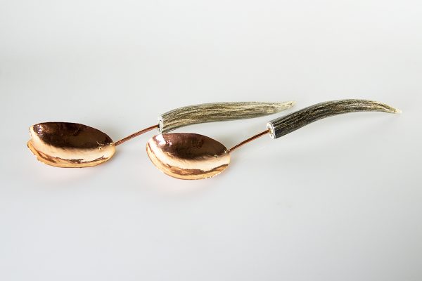 I use traditional metalsmithing techniques including hammering, raising, and chasing by hand with traditional tools, but also tools of my own design. I also use age-old scrimshaw techniques to embellish the burr antler ends and where the antler meets the copper or silver portion of the handle. All of my materials, the purest available copper, silver and naturally-shed antler, are sourced in the USA to create each one-of-a kind piece in my Nashville studio.