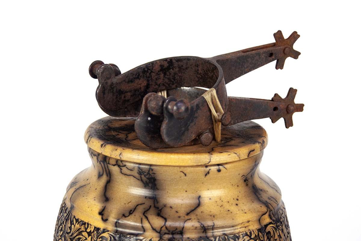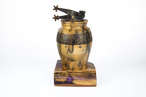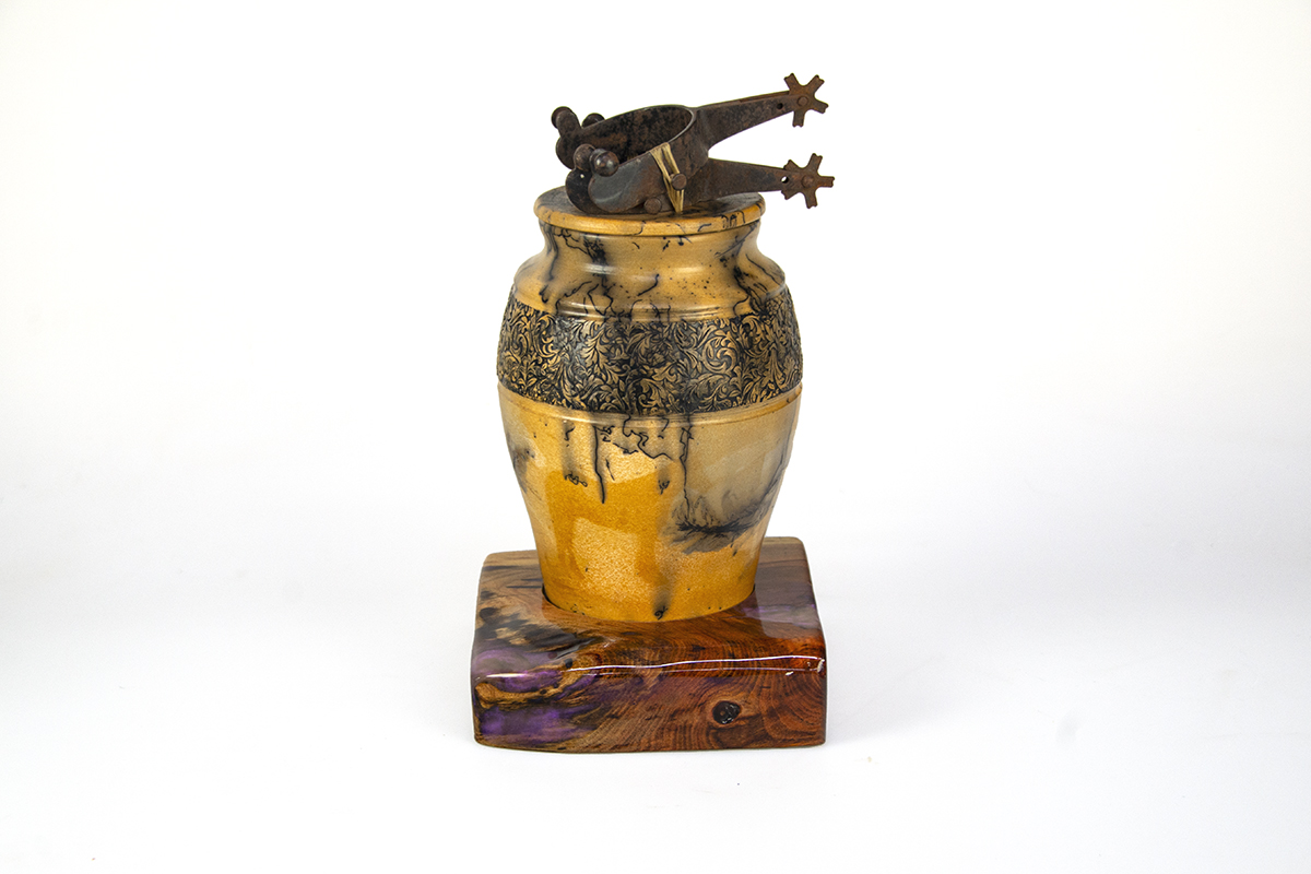 The design is further elevated by an intricate ornamental band near the rim, providing a rich, dark contrast to the smoky texture below. Crowned with a pair of antique-style steel spurs, this jar instantly evokes the spirit of the open range. It rests upon a high-gloss, live-edge burl wood base with stunning purple and amber tones, providing a stable, gallery-quality foundation.