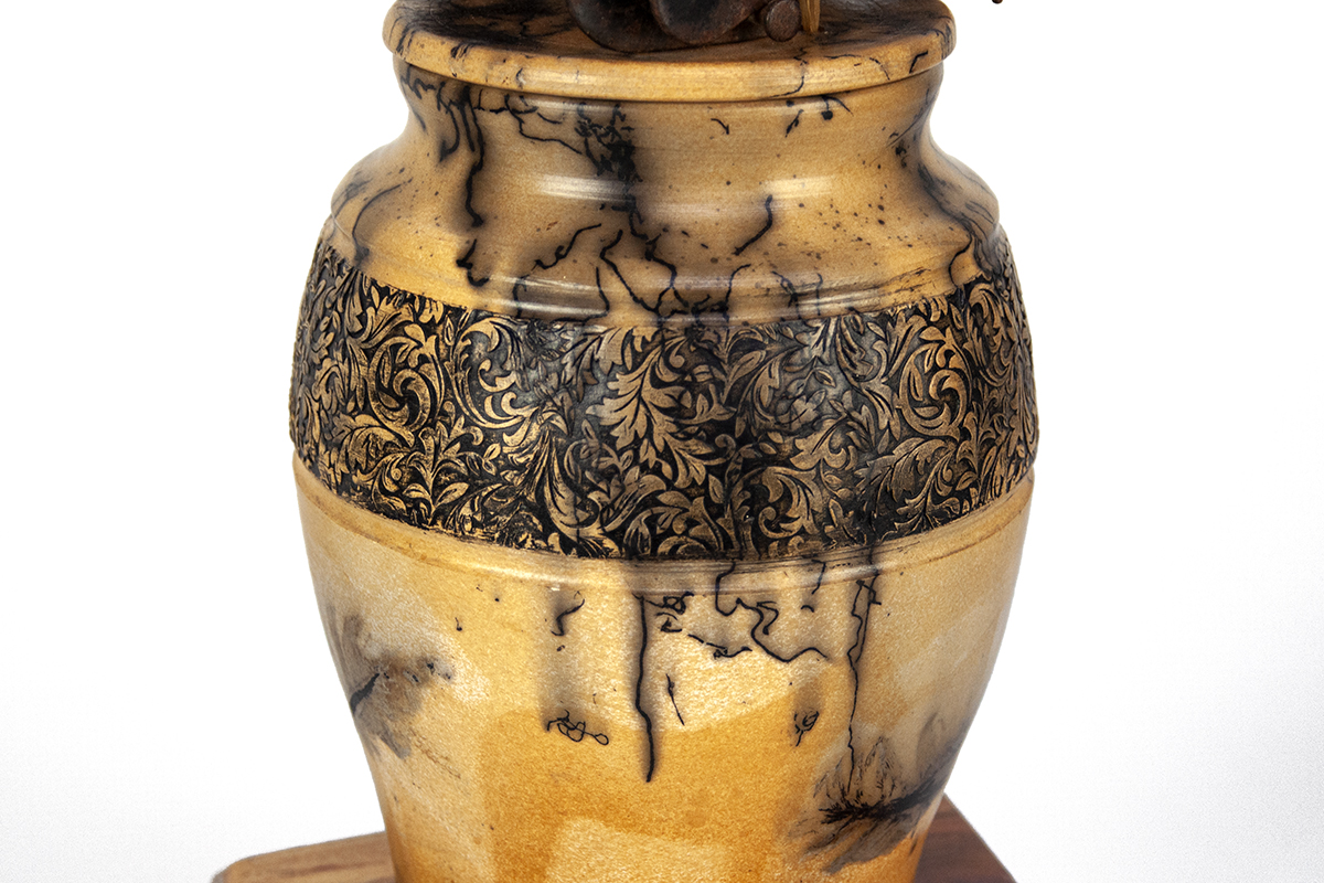 This piece masterfully blends materials and history: the body of the jar is hand-thrown clay, finished with a unique horsehair raku technique. As the jar is fired to high temperatures, carefully placed strands of horsehair sear onto the surface, creating the mesmerizing, organic, black-and-tan marbling and smoke trails that make each piece absolutely unique.