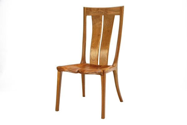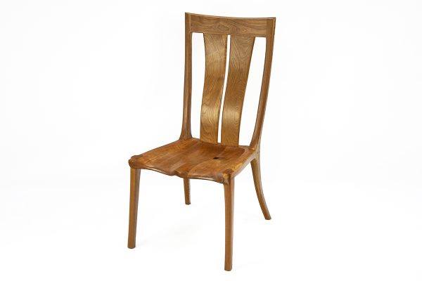 The chair is defined by its hand-sculpted saddle seat, deeply contoured to cradle the sitter perfectly. Rising from the seat is a graceful, high backrest featuring floating vertical slats that curve gently to support the spine. The frame is constructed from solid hardwood (likely Cherry or a similar warm-toned wood), showcasing a rich, amber hue and lively grain patterns.