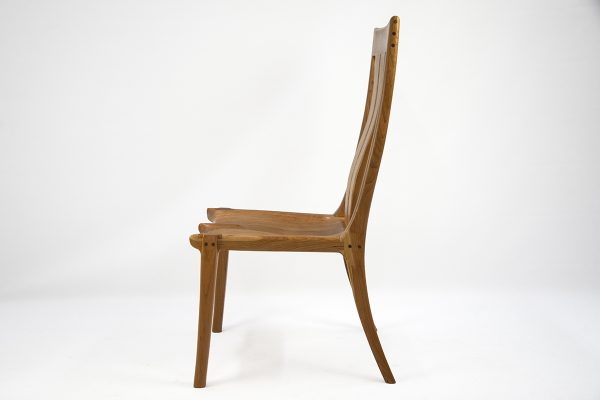 Inspired by the legendary styles of Sam Maloof and other master woodworkers, the joinery is a focal point in itself. Smooth, fluid transitions connect the legs to the seat, and subtle, dark contrasting plugs (visible at the joints) add a touch of refined detail that speaks to the quality of construction.