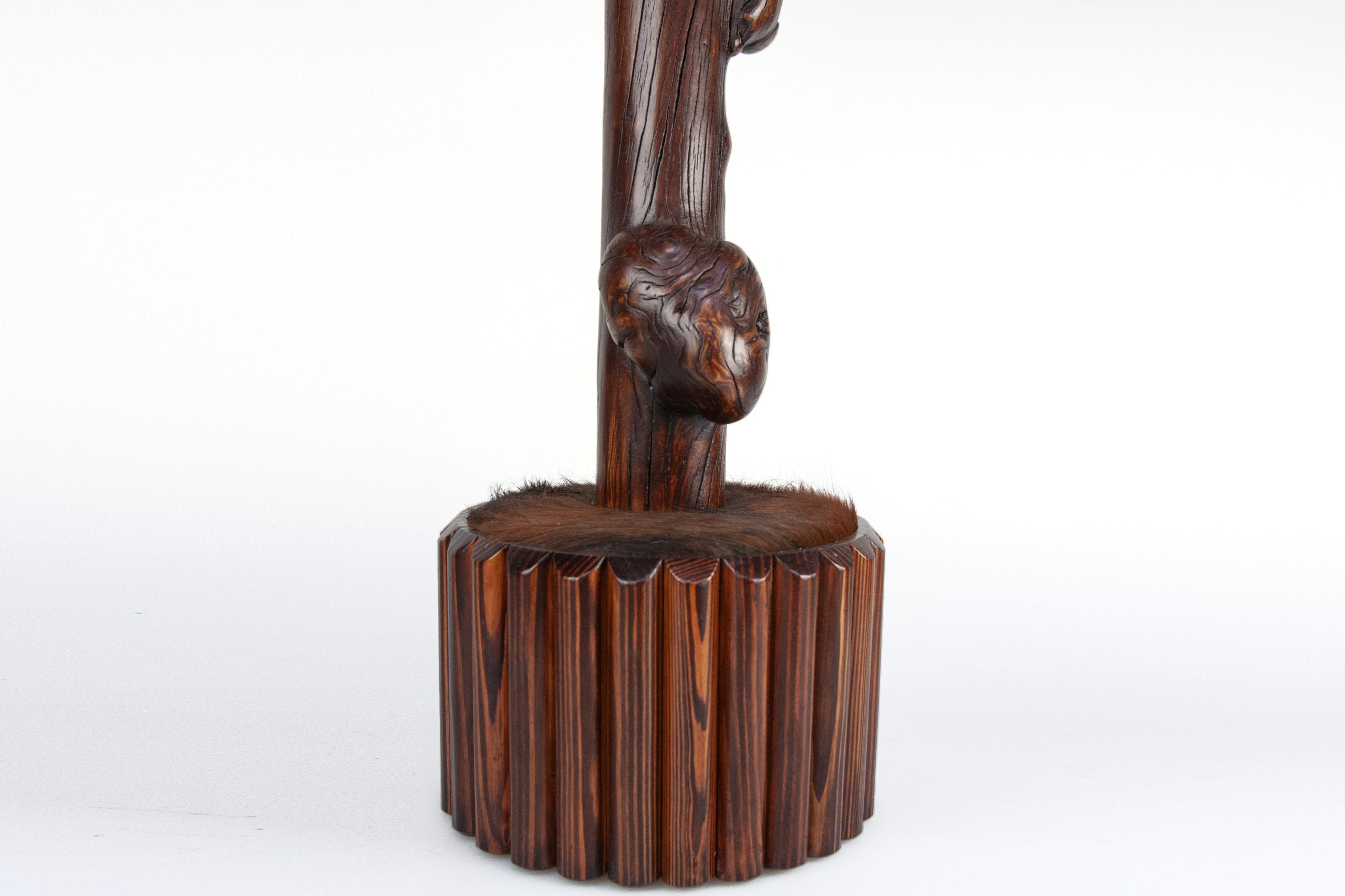 Ask the ArtisanElevate your space with this one-of-a-kind drink stand, a testament to natural beauty and craftsmanship. Crafted from a unique combination of richly textured wood and supple leather, this piece exudes rustic elegance. The organic shape of the wood is beautifully complemented by the warm tones and textures of the leather accents. This stand is not only a functional piece but also a work of art that will add character and style to any room.