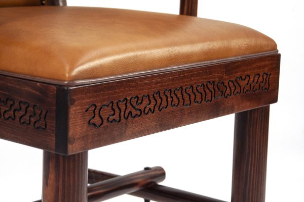 Ask the ArtisanBring the rugged elegance of the American West into your home with this distinctive armchair. Inspired by classic Western design, this chair combines sturdy craftsmanship with unique artistic details. The rich wood frame provides a solid foundation, while the supple leather upholstery offers exceptional comfort. The eye-catching elk silhouette on the chair back adds a touch of rustic charm and celebrates the beauty of wildlife. Decorative studding and intricate carved accents further enhance the chair’s authentic Western appeal. This armchair is more than just a place to sit; it’s a statement piece that embodies the spirit of the frontier.