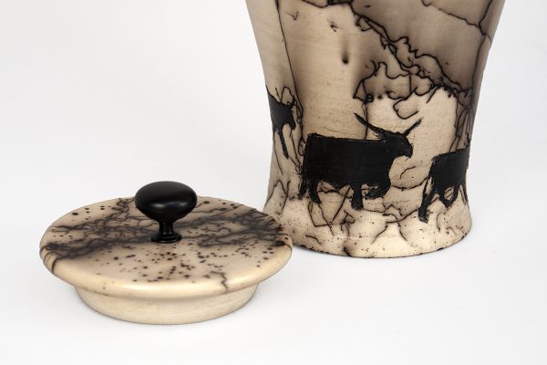 Ask the ArtisanA commanding piece of handcrafted art, the Longhorn Ranchers Jar is a tribute to the rugged beauty of the open range and the iconic spirit of the American West. The surface features dramatic, fine black lines and striking, random patterns achieved through the unique and mesmerizing horsehair firing technique. During this specialized process, strands of horsehair are applied to the red-hot ceramic, instantly carbonizing to create these signature smoky trails. This ensures that no two jars are exactly alike, making your piece a one-of-a-kind heirloom.