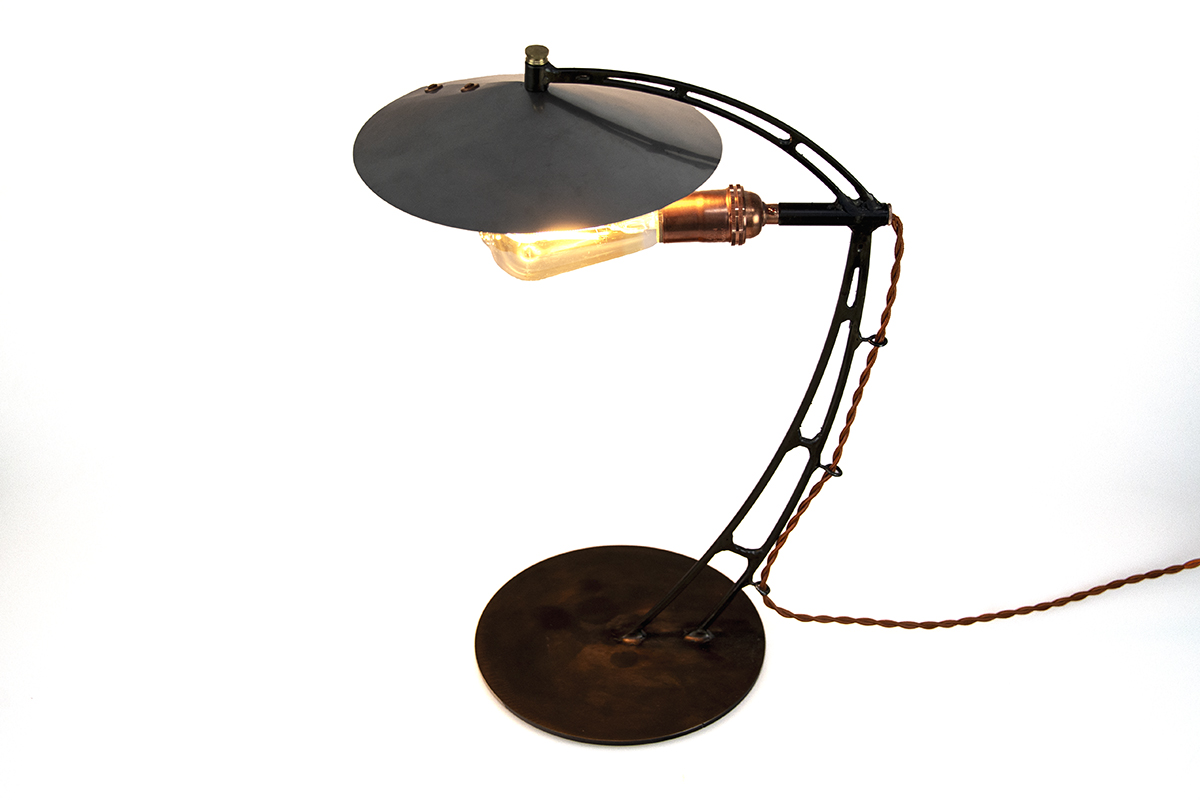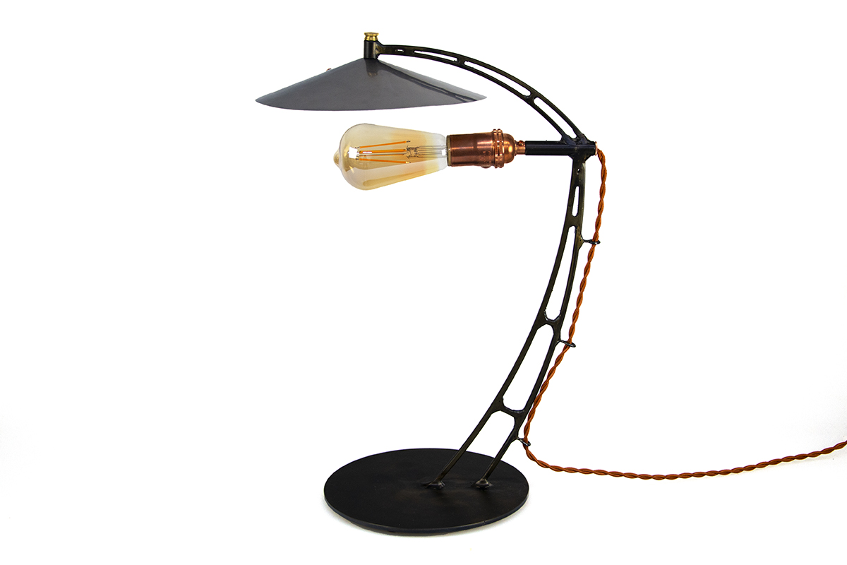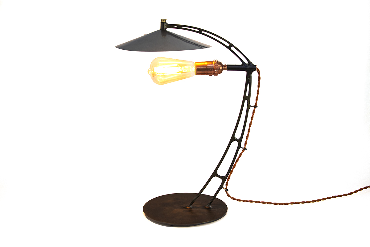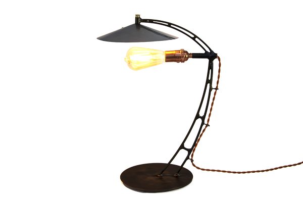 A study in sweeping arcs and industrial poise, the Metal Cowboy Lamp transforms raw utility into a piece of functional sculpture. Its silhouette is defined by a slender, perforated steel spine that rises from a heavy circular base like a bridge across a modern skyline. This dark, hand-finished frame balances a wide, low-profile shade that casts a focused pool of light, perfect for illuminating the dark grain of a mahogany desk or the crisp lines of a drafting table.
