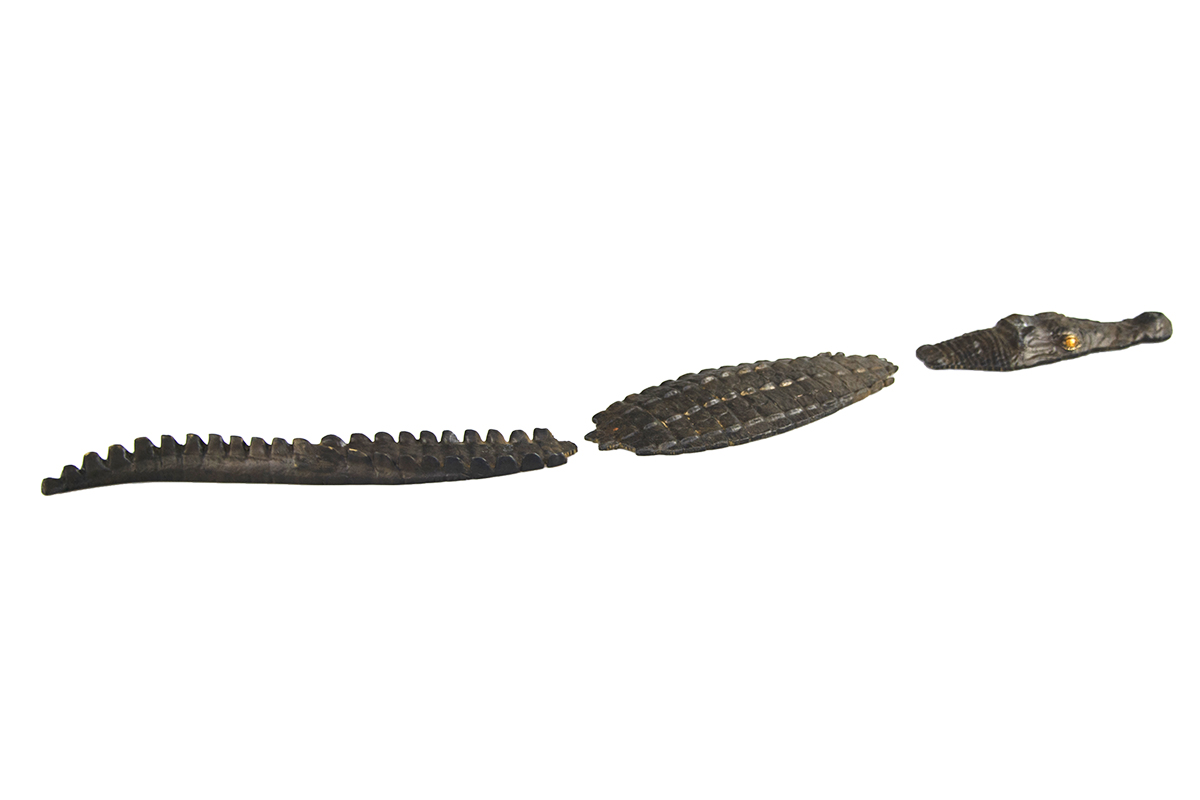 The segmented design invites the eye to travel along the length of the form, emphasizing movement, strength, and the distinctive patterns of the alligator’s armor-like hide. Subtle surface variations and a dark, earthy finish add depth and character, giving the piece a sense of age and story.