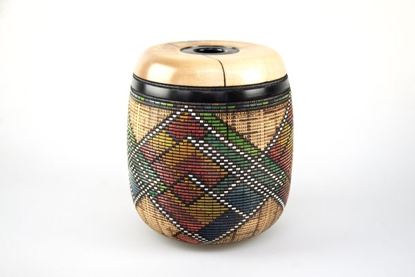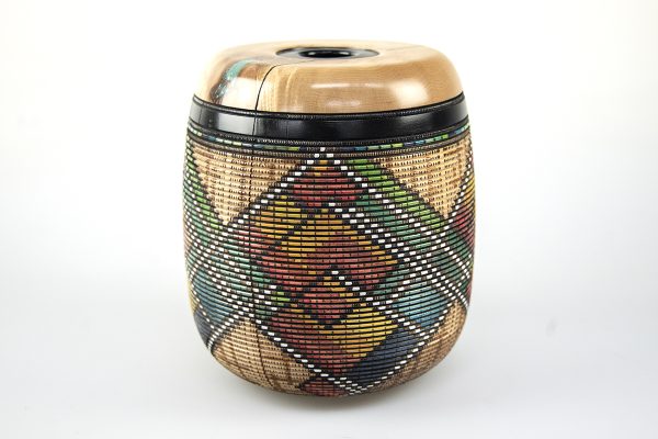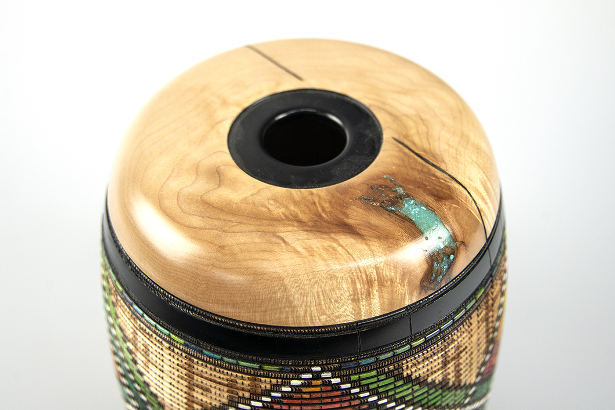 A self-taught, second generation wood artisan, Keoni Carlson’s work explores shape, texture, color, and complex patterns. His work reimagines wood as woven and beaded basketry inspired by Native American storytelling, legend, and mythology. Keoni takes simple, functional shapes and transforms them into touchable illusions that blur the craft/fine art distinction. Keoni uses fire, ink, and sharpened steel to create his pieces, which are story-driven. As he carves and colors, the narrative emerges.