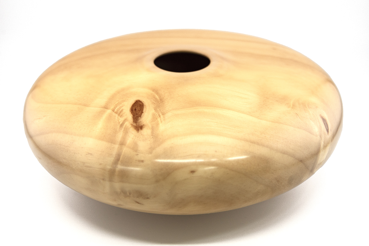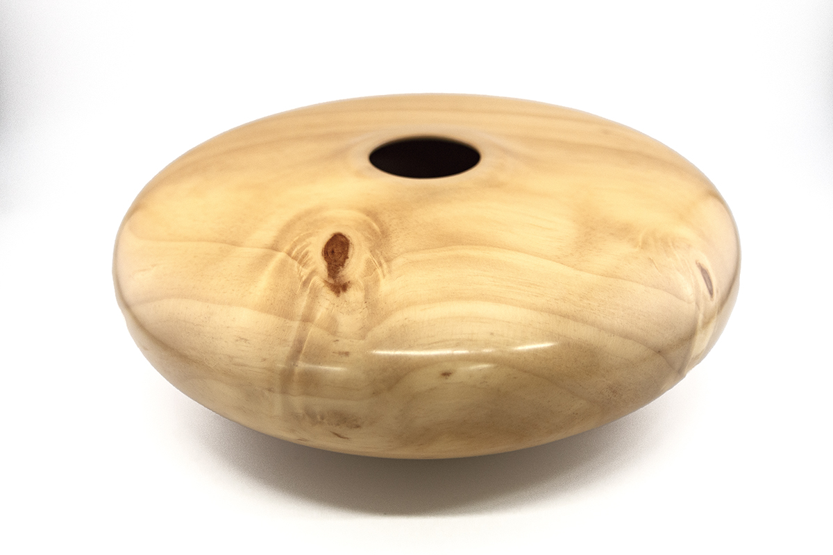 The vessel features a low-profile, lenticular shape reminiscent of a river stone worn smooth by time. Its surface is polished to a lustrous satin sheen, highlighting pine’s signature honeyed hues and bold grain definition. The design embraces the wood’s organic history: sweeping growth rings wrap around the form, punctuated by a striking, dark knot, a hallmark of the material that adds depth and a unique focal point.