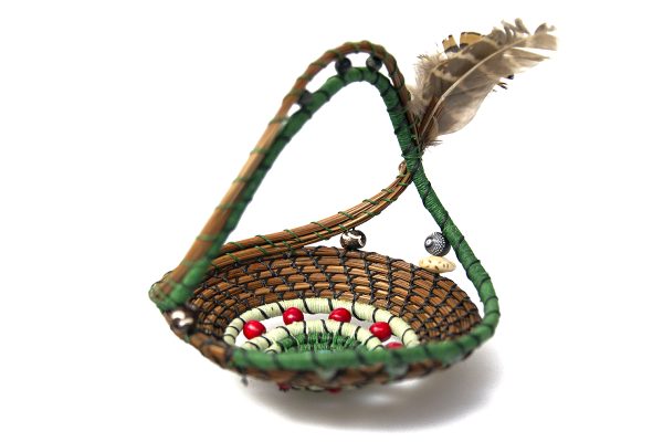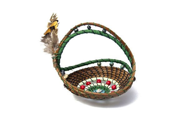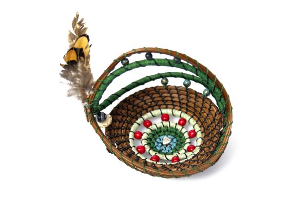 This piece is brought to life with curated artisanal details, from the lustrous red and metallic beads nestled within the coils to the delicate natural feathers that add a sense of organic movement. The unique, high-arched handle elevates the silhouette from a simple bowl to a sculptural statement piece, making it a guaranteed conversation starter for your home. Whether displayed on a mantle, used to hold precious keepsakes, or given as a thoughtful heirloom gift, this basket carries the quiet strength of the pines and the unique spirit of the artisan.