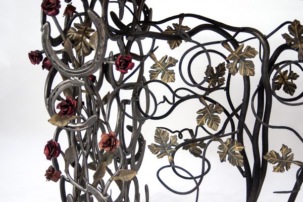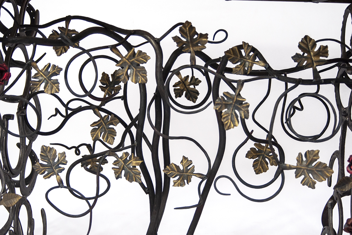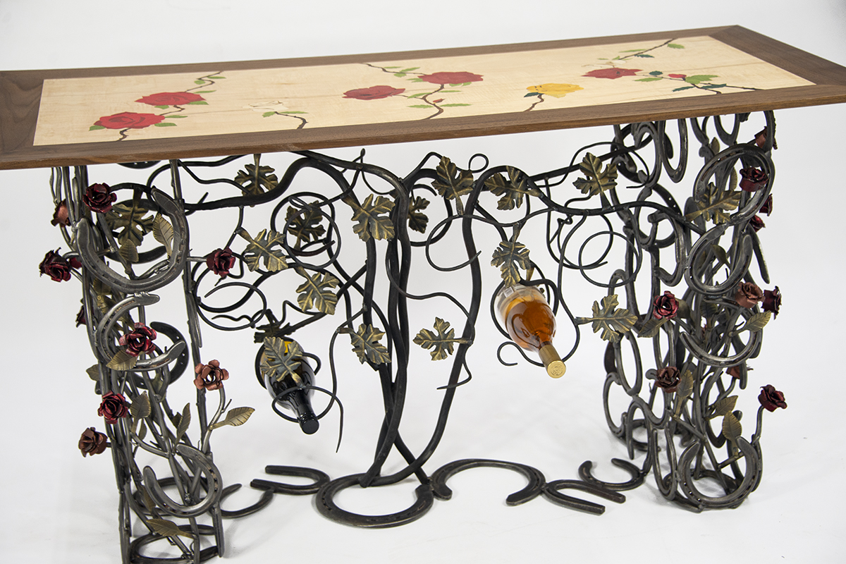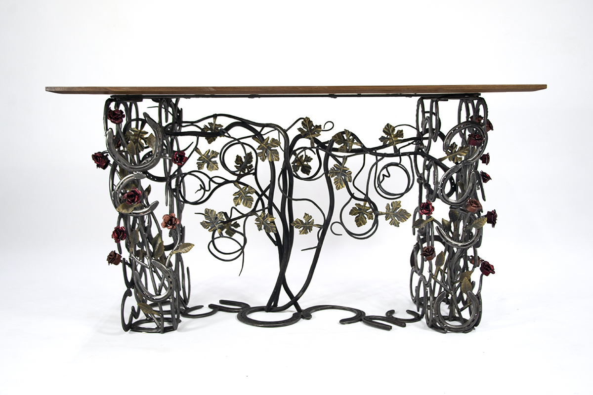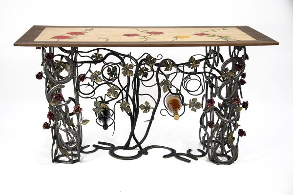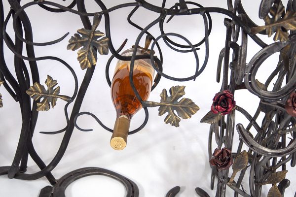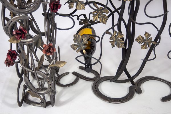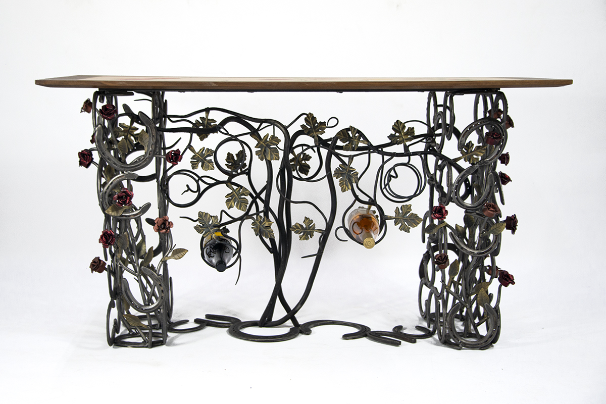 Beneath the refined surface lies a base of extraordinary character. Authentic horseshoes have been heated, shaped, and welded into an intricate, vine-like structure that serves as both a sturdy foundation and a sculptural wine rack. The iron vines curve naturally to cradle favorite vintages, making the wine collection part of the artwork itself. Hand-painted metal leaves and sculptural red roses wind through the horseshoe trellis, echoing the floral design above. This substantial ironwork ensures the piece is as enduring as it is beautiful, a true heirloom designed to anchor a room with a legacy of quality.