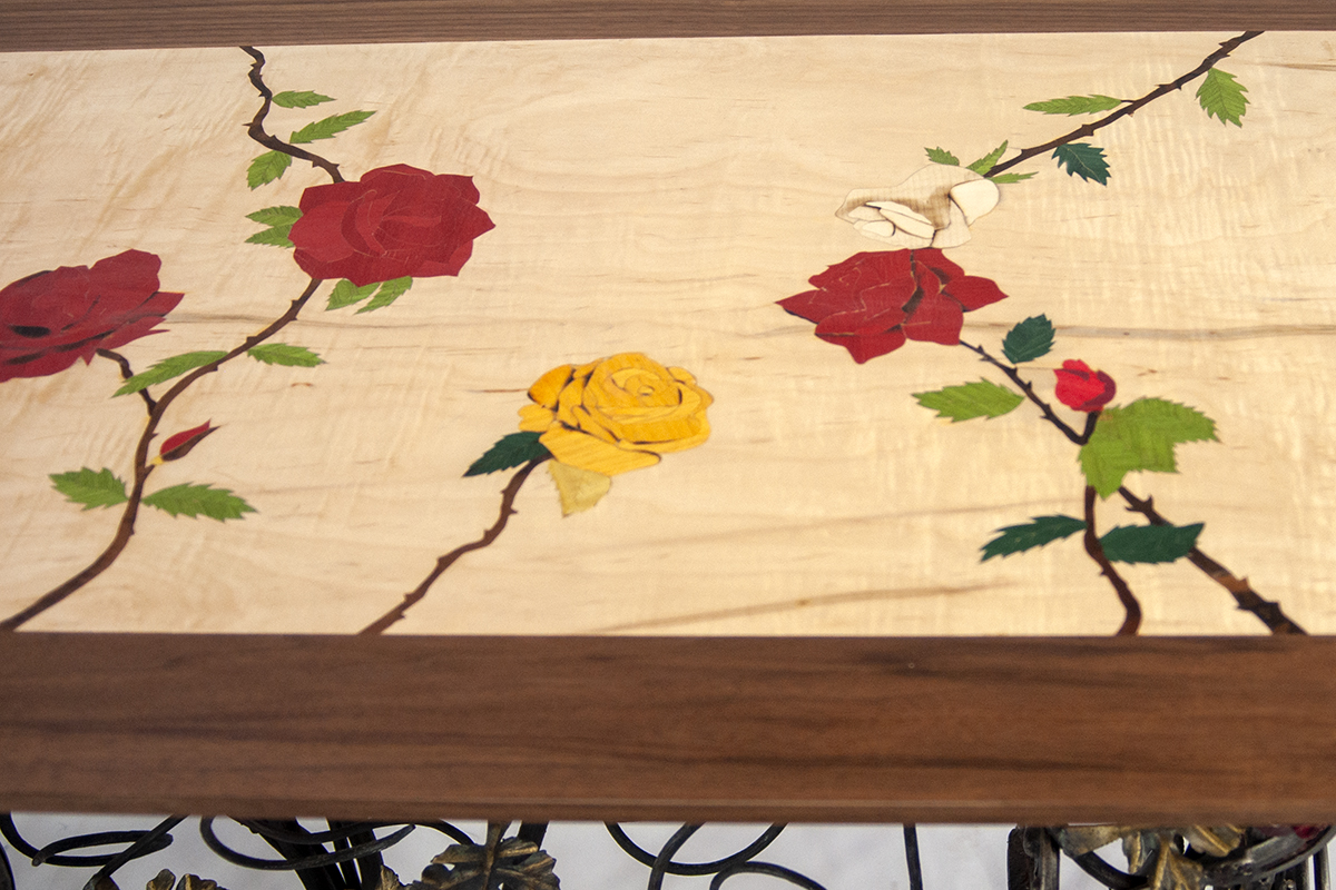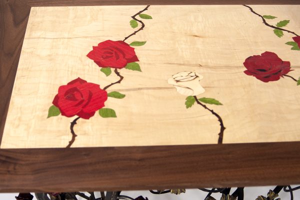 Walnut Burl forms the stems of the roses, its organic grain adding movement and lifelike character.