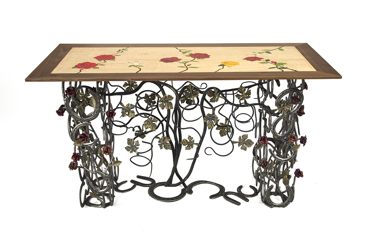 This table is an original, one-of-a-kind functional masterpiece, entirely handcrafted and designed to tell a story of heritage, grit, and grace. It represents a striking fusion of two distinct worlds: the delicate precision of classical marquetry and the rugged, hand-forged spirit of the blacksmith’s anvil.
