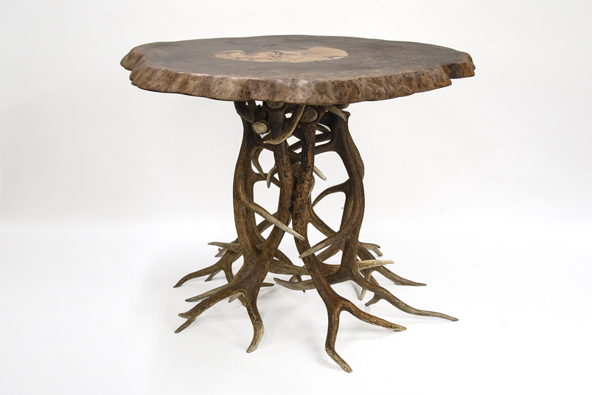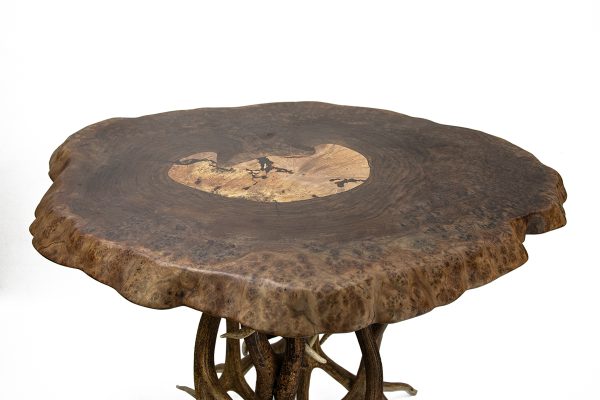Ask the ArtisanBring the spirit of the wilderness into your home with this handcrafted pub table, a striking blend of natural artistry and refined craftsmanship. The tabletop is made from rich walnut with a maple burl inlay, showcasing the beauty of the wood’s unique grain and organic edges. Supporting this one-of-a-kind piece is a sculptural base crafted from authentic elk antlers, arranged to create both strength and natural flow.